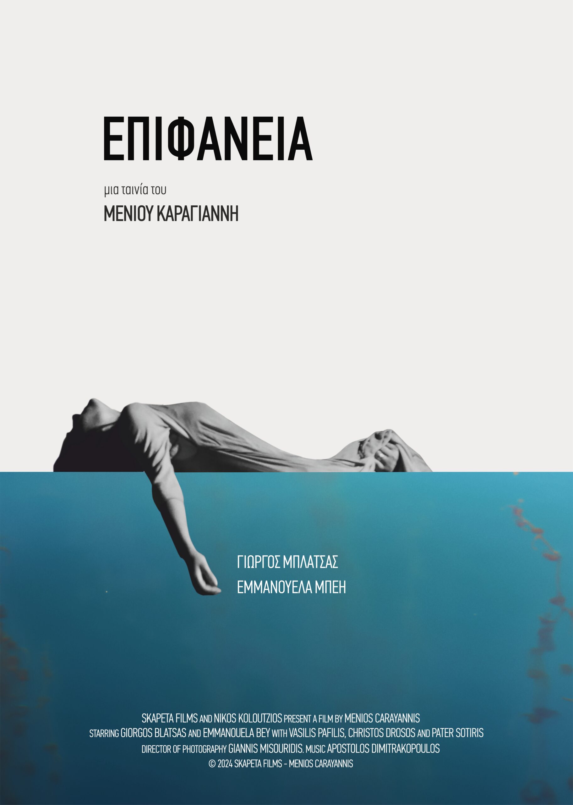 Αφίσα για την ταινία Επιφάνεια του Μένιου Καραγιάννη. Τον Ιούνιο του 2024, σχεδόν ένα χρόνο μετά από την άγρια καταστροφική πλημμύρα στον θεσσαλικό κάμπο (Σεπτέμβρης 2023, Daniel), γυρίζεται η ταινία Επιφάνεια από τον Καρδιτσιώτη σκηνοθέτη Μένιο Καραγιάννη στις περιοχές που επλήγησαν. Σενάριο / Σκηνοθεσία: Μένιος Καραγιάννης, Διεύθυνση φωτογραφίας: Γιάννης Μισουρίδης. Με τους: Γιώργο Μπλάτσα και Εμμανουέλα Μπέη Παραγωγή: Μ. Καραγιάννης 2025 Αφίσα / Art director: Φλώρου Εύη