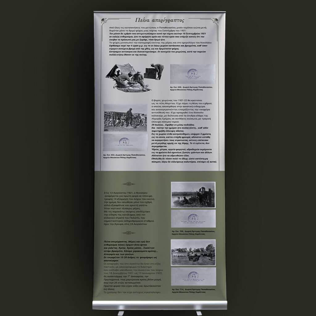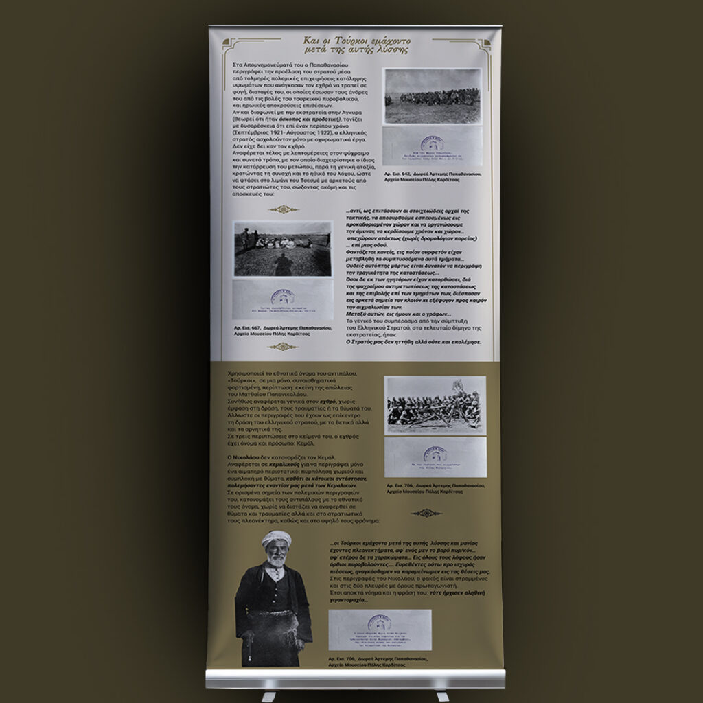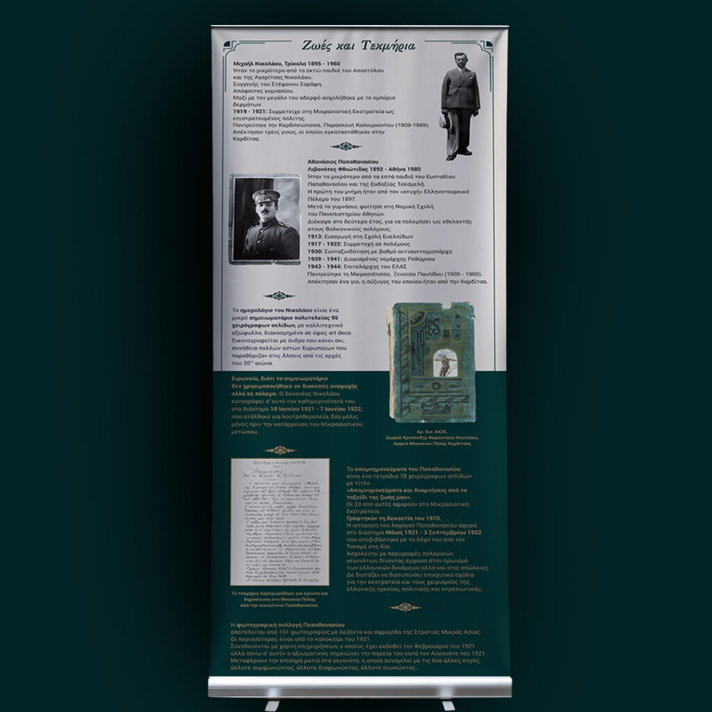 Το ημερολόγιο του δεκανέα Μιχαήλ Νικολάου (1895-1960) διασταυρώνεται με τα απομνημονεύματα και το φωτογραφικό αρχείο του λοχαγού Αθανασίου Παπαθανασίου (1892-1980). Aναμνήσεις από τη Μικρασιατική Εκστρατεία μέσα από τις συλλογές του Μουσείου Πόλης Καρδίτσας». Φεβρουάριος 2025. Το υλικό της έκθεσης είναι αναρτημένο στην ιστοσελίδα του μουσείου https://mpk.gr/anamniseis/.