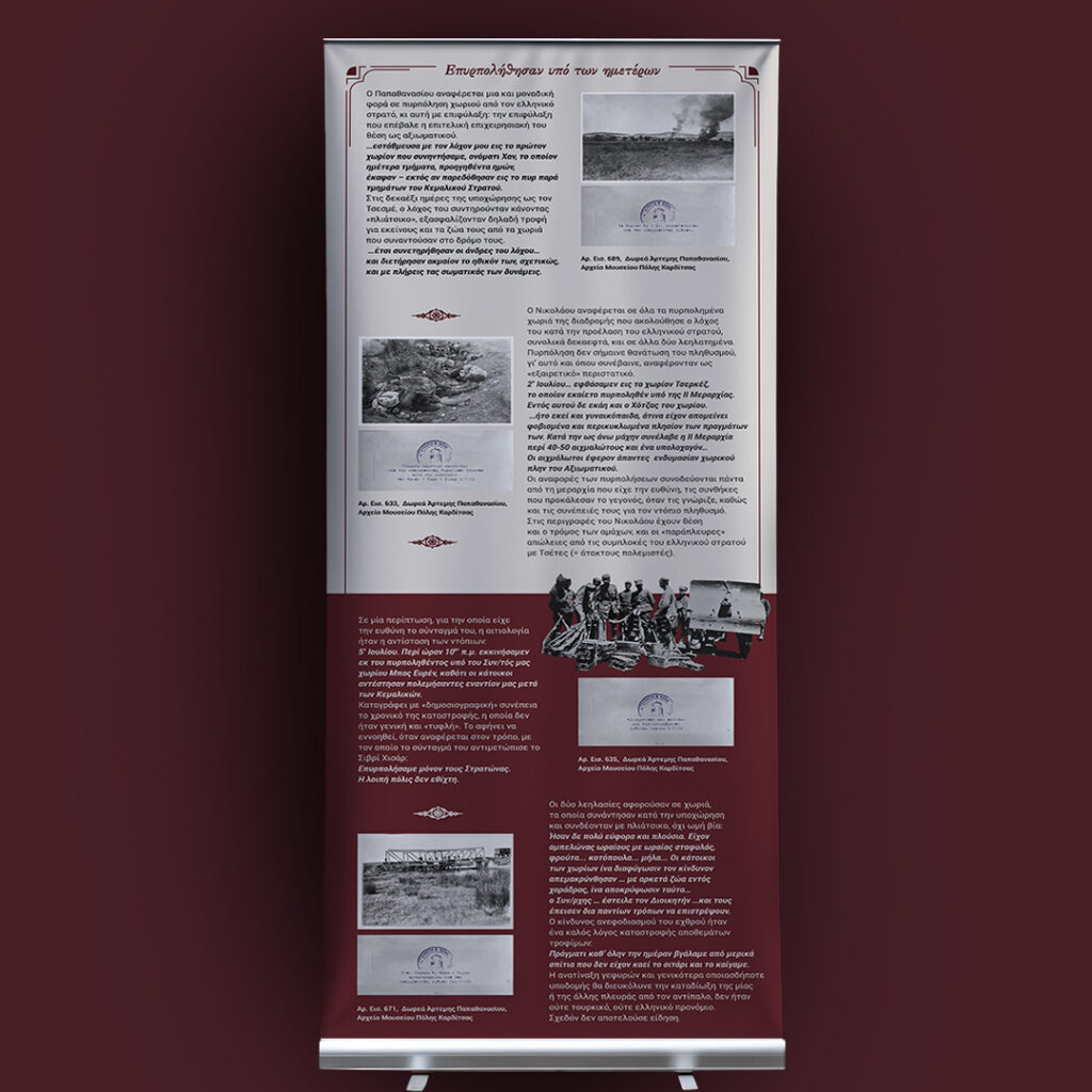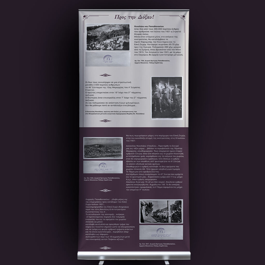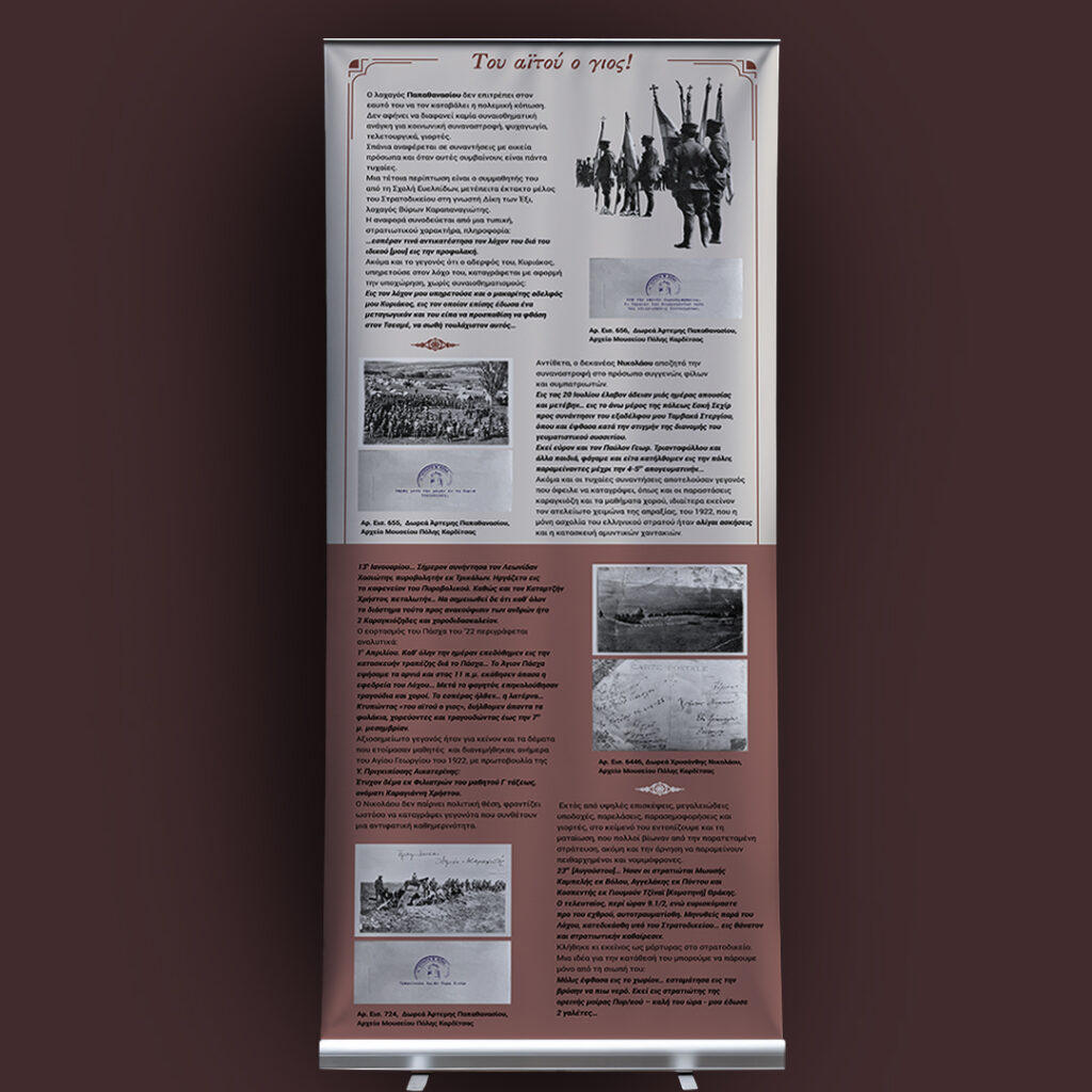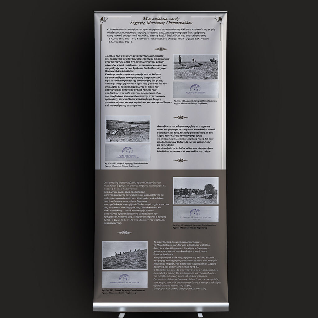 Το ημερολόγιο του δεκανέα Μιχαήλ Νικολάου (1895-1960) διασταυρώνεται με τα απομνημονεύματα και το φωτογραφικό αρχείο του λοχαγού Αθανασίου Παπαθανασίου (1892-1980). Aναμνήσεις από τη Μικρασιατική Εκστρατεία μέσα από τις συλλογές του Μουσείου Πόλης Καρδίτσας». Φεβρουάριος 2025. Το υλικό της έκθεσης είναι αναρτημένο στην ιστοσελίδα του μουσείου https://mpk.gr/anamniseis/.